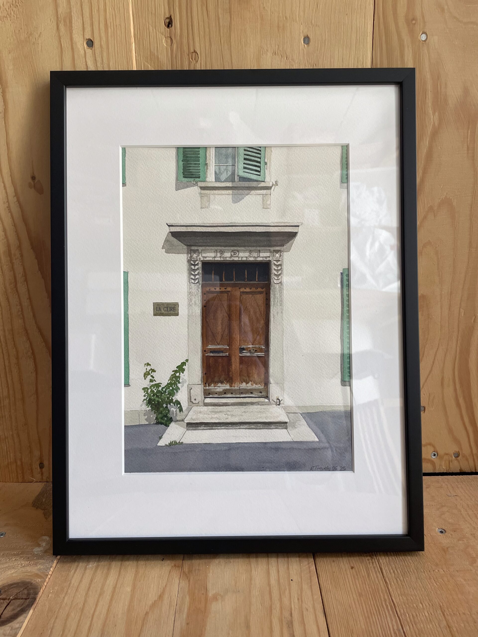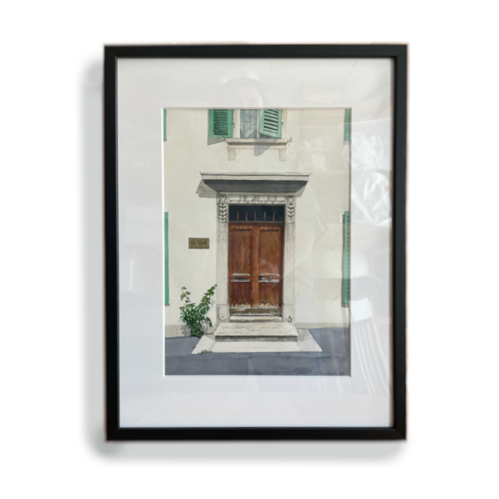 Inclusive de l’encadrement, cette oeuvre fait partie du séries des “portetraits” qui explore les portes emblématiques de La Chaux-de-Fonds.