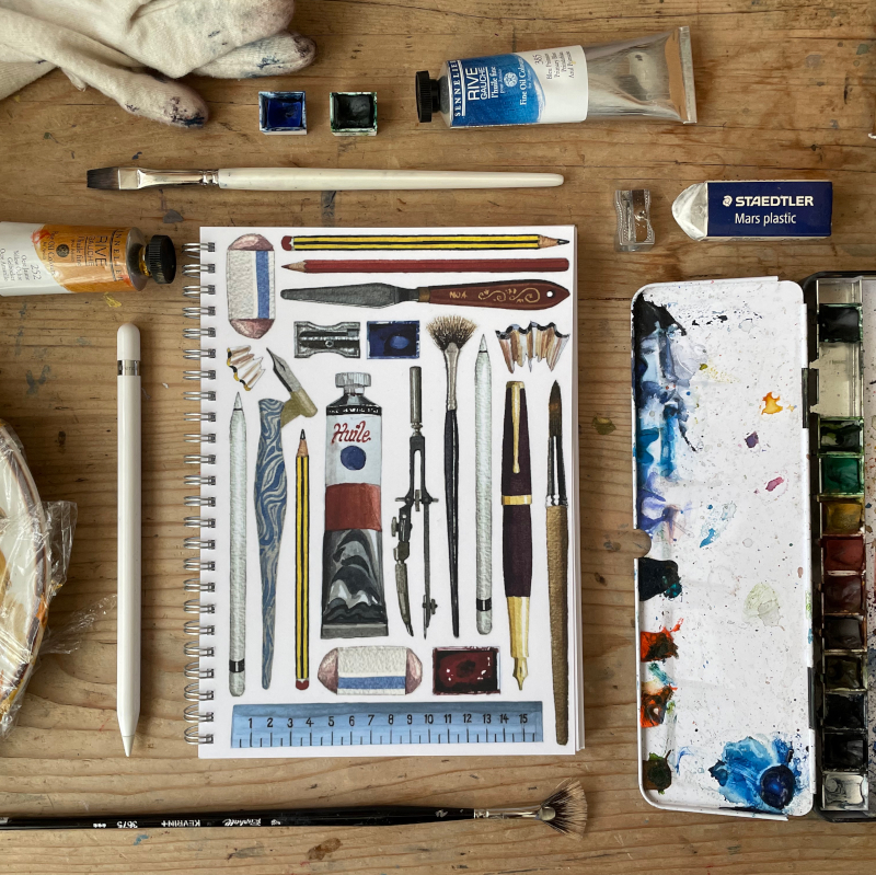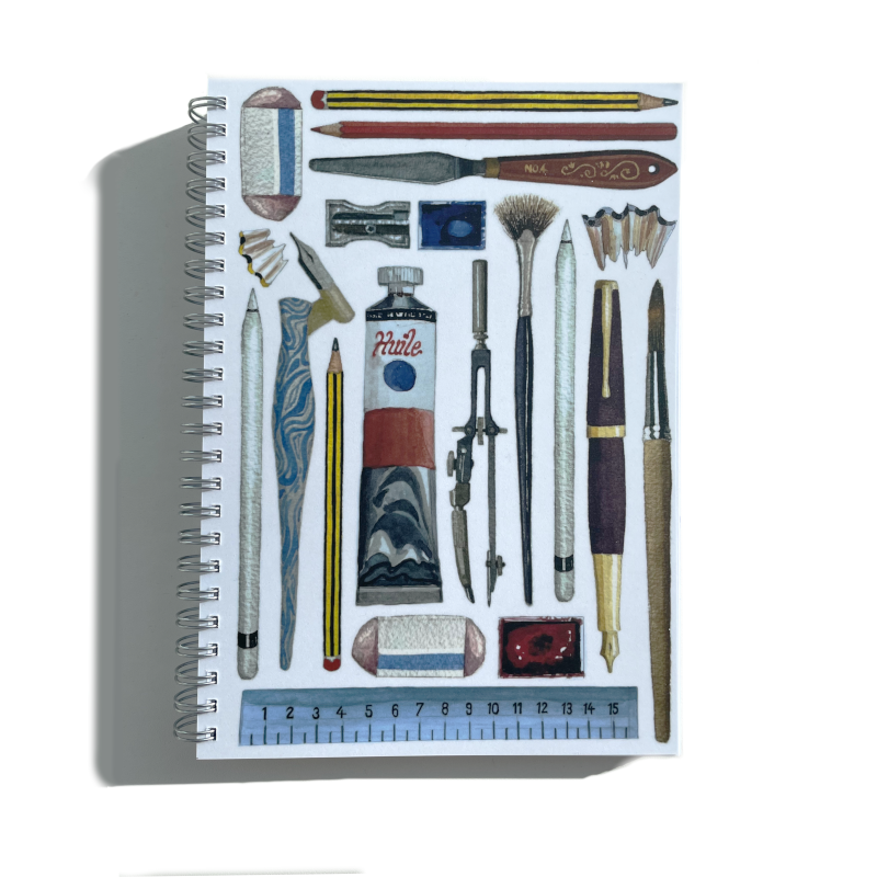 Le schéma pour ce carnet est le prochain dans un séries, qui a commencé avec les outils d’horlogerie et les composants de l’horlogerie. Rebecca est fascinée par le relation que nous développons avec les objets qui nous alentours, et elle croit que nos outils acquérir de la charme et deviennent des amis avec l’usage régulier. Ce cahier continue cette thème en explorant la familiarité des artistes avec leurs outils préférés. Il est alors un cadeau idéal pour toute personne et encourage l’expression de leur créativité.