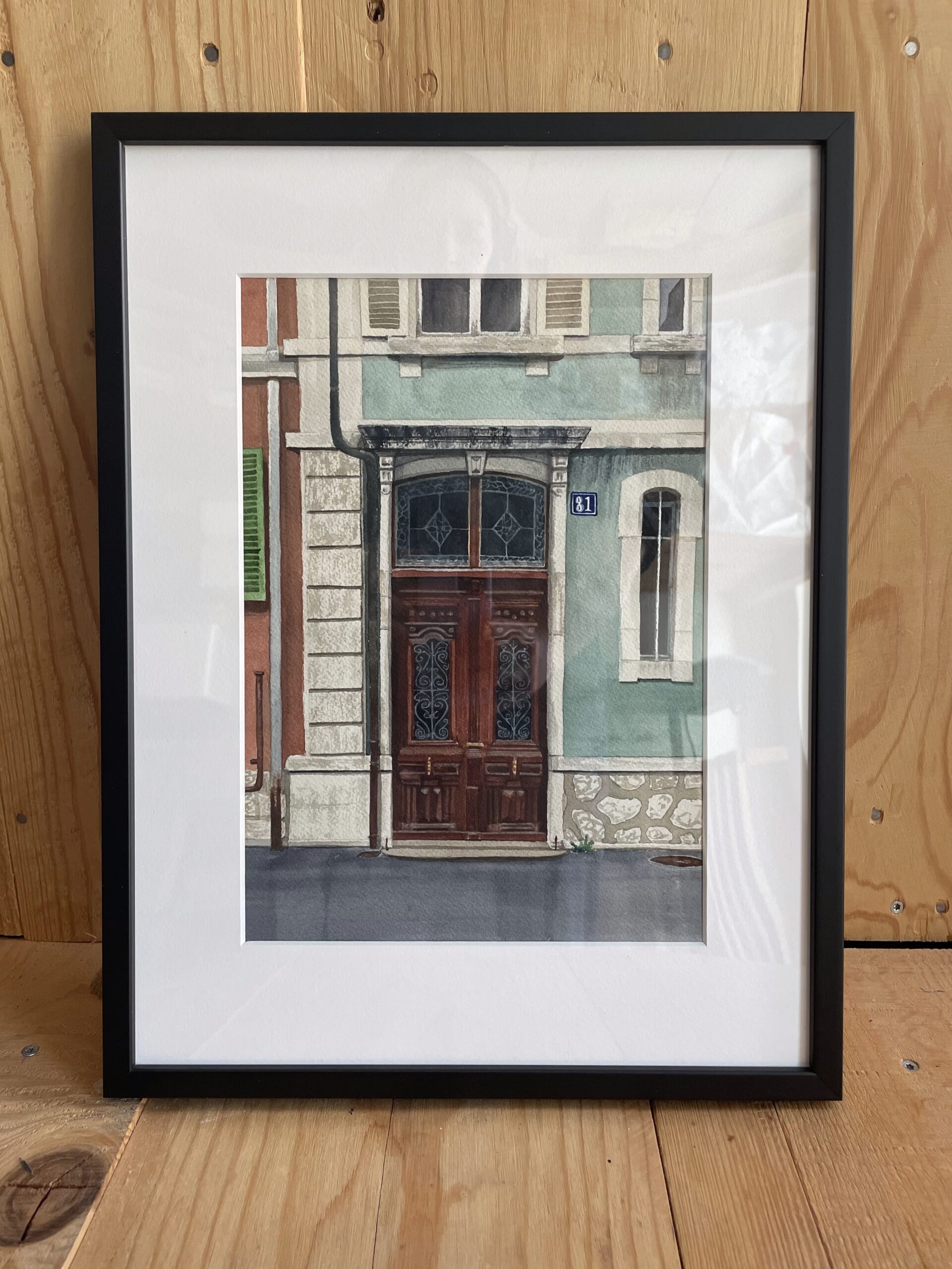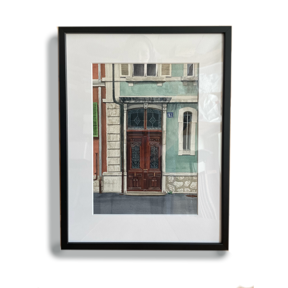 Inclusive de l’encadrement, cette oeuvre fait partie du séries des “portetraits” qui explore les portes emblématiques de La Chaux-de-Fonds.